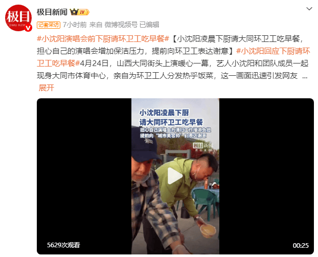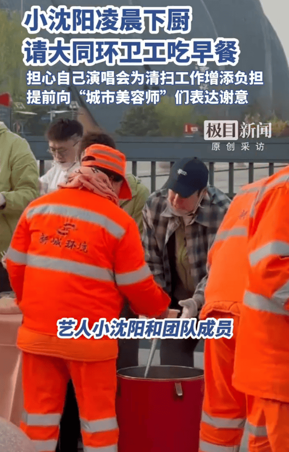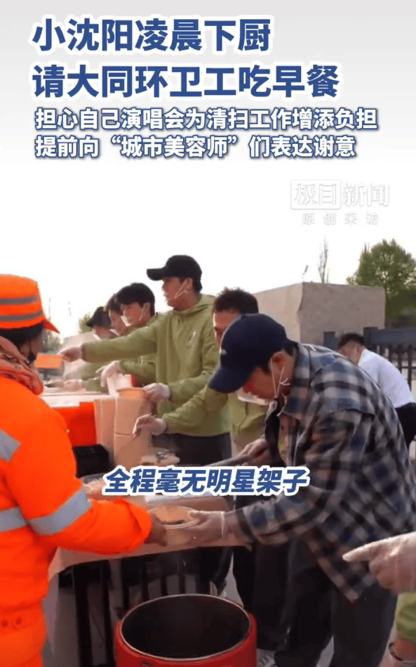 4月26日,当时在现场的一位视频拍摄者告诉极目新闻记者,小沈阳即将在大同开演唱会,担心散场后给环卫工人增大清扫压力,所以提前自备饭食请环卫工吃饭,小沈阳真的太用心了。